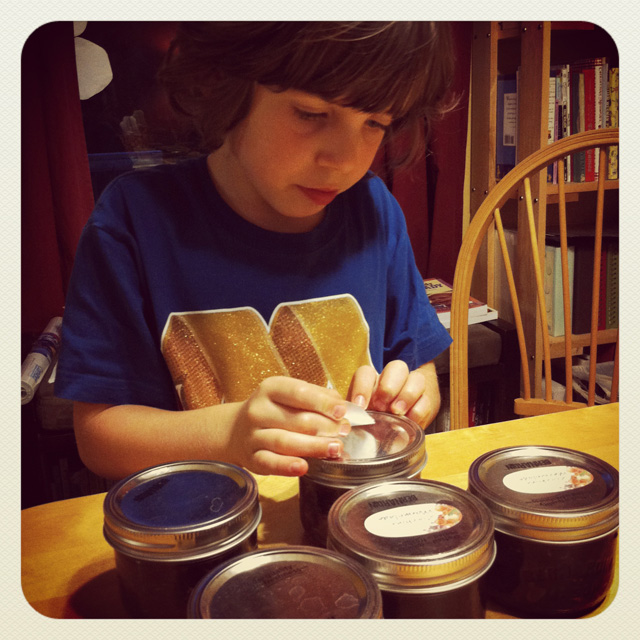 I let it sit for the 5 minutes the recipe stated. I started getting all excited about my first time making jam (yay!) and forgot to skim the top before ladeling it into the jars. :0 Ah well, it’s a learning process. L was eager to help with the labeling and did a great job. I think it was a great idea to put the labels on the tops since we wouldn’t be using them again for jams. Again, what do you do with all these unused lids??