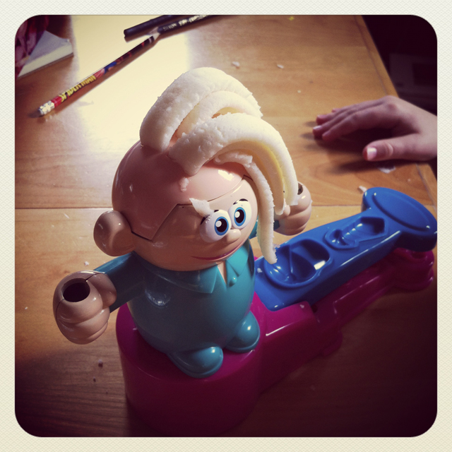 This is something that I have been wanting to do for a while but just haven’t gotten around to. The clay takes about 5 minutes to make and it so easy to prepare. The best part, for me, was kneading it and feeling the soft warmth of the mix between my hands. The boys love using the clay to roll out, cut up into pieces, and squeeze through play dough heads (just when I was going to bag up all the play dough toys and drop them off at Value Village!).