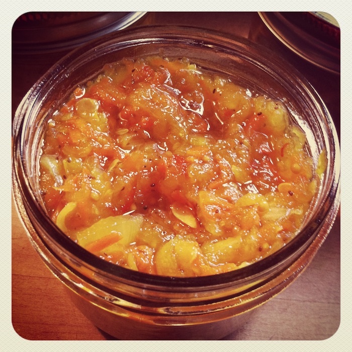 Funny thing is that four of the jar lids didn’t ‘pop’ after 24 hours as they should to show it’s good to go/ready to store and eat pretty much whenever. Steve brought one of these jars into work and popped it into the fridge. By lunchtime when he went to retrieve it the lids had popped. Weird. So, I stuck the rest into the fridge at home and what do ya know? They popped! Nice. Thanks, Steve. Inadvertently, but thanks, nonetheless.