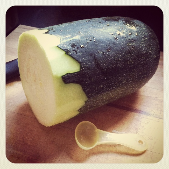 My lovely sister-in-law gave me a recipe for zucchini relish. I needed something to do with the woppin’ big zucchini my friend, Juli, had dropped off from her parents’ garden – it’s huge! Here is a pic of it with a teaspoon measure to get the idea. Well, this is half of it as I’d already used some for the zucchini marmalade recipe I got from Juli…the boys went crazy when they saw it!