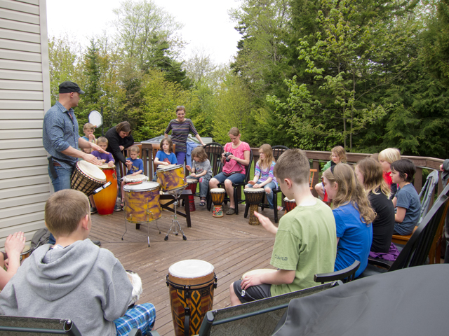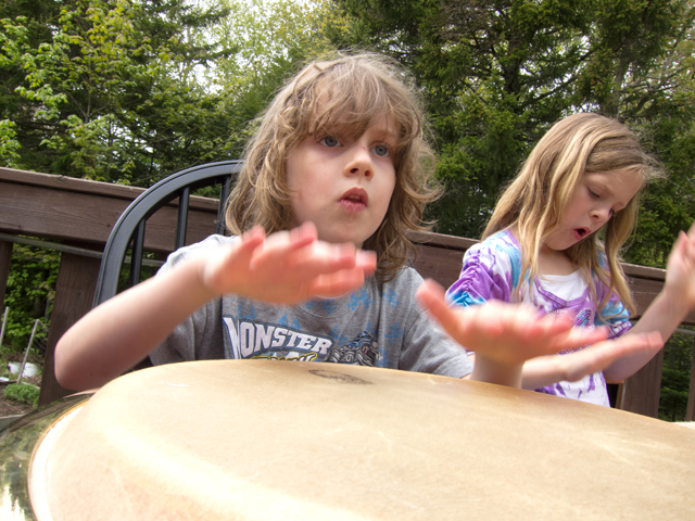 The kids, mine included, swarmed around the trampoline and I was wondering if I would be able to pull them off once Andrew came with the drums! I had nothing to worry about for when he arrived many children stopped whatever they were doing and helped bring the drums up onto the deck. There were enough drums for all children and some adults as well. I don’t know how he fit them all into his wee car. Must’ve been some magic involved.