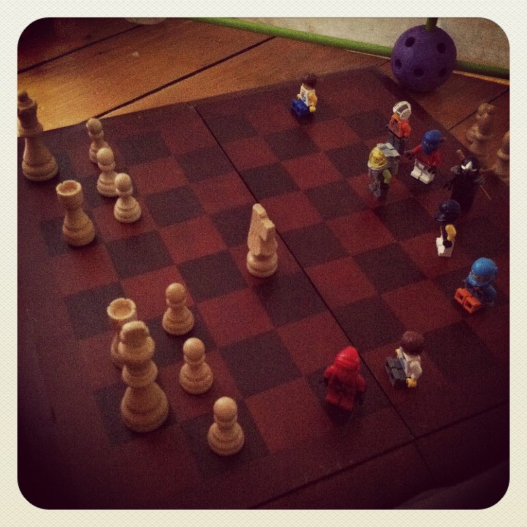 A fort plus chess. A chess game plus some new pieces. How they can tell who is now who is beyond me. But that’s okay. It’s not for me to know. It’s for children’s brains to create, assign and understand.